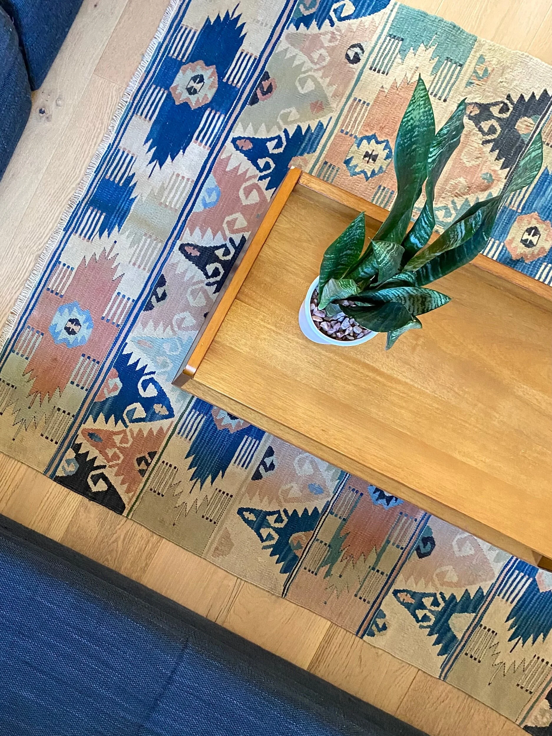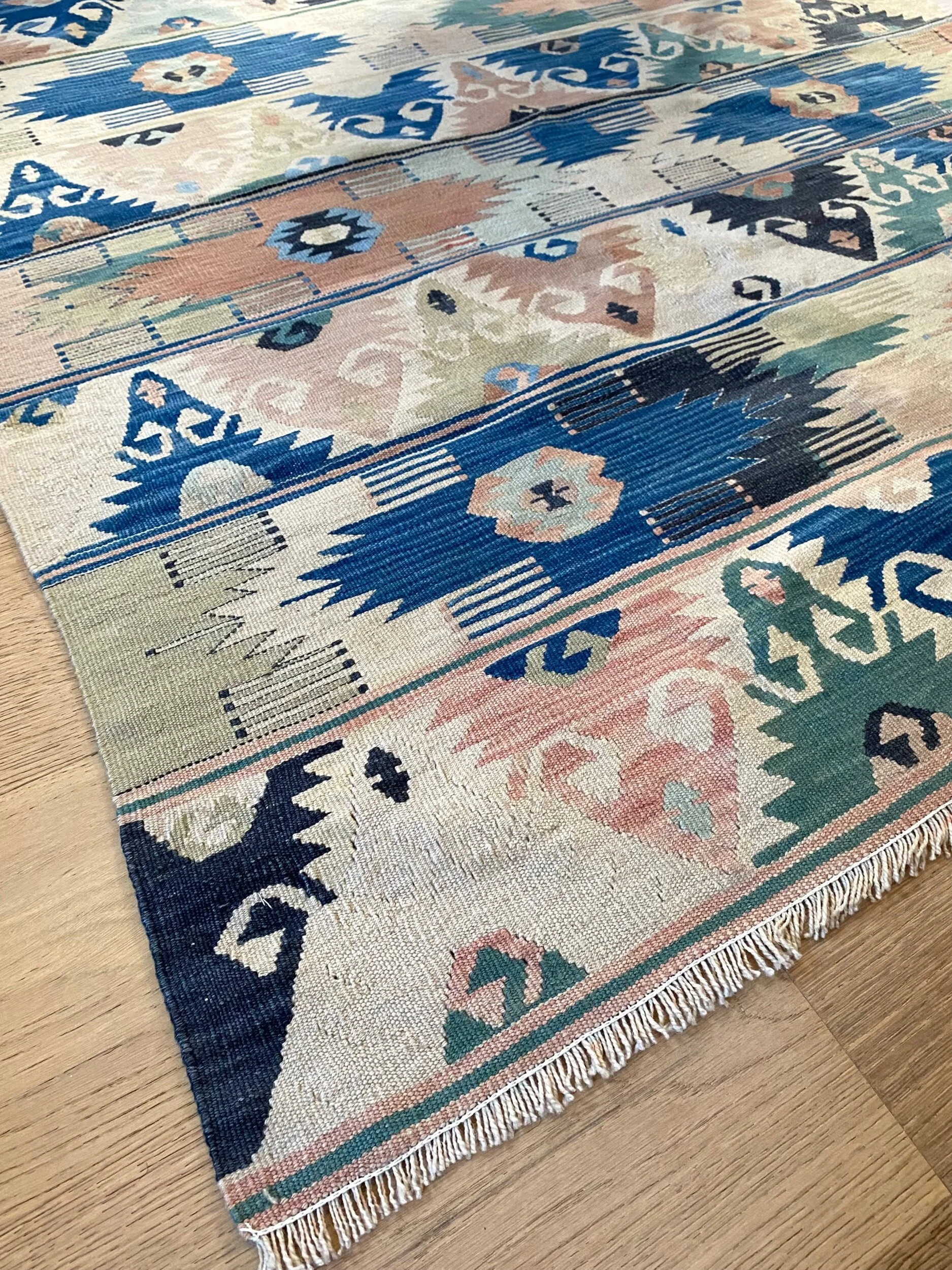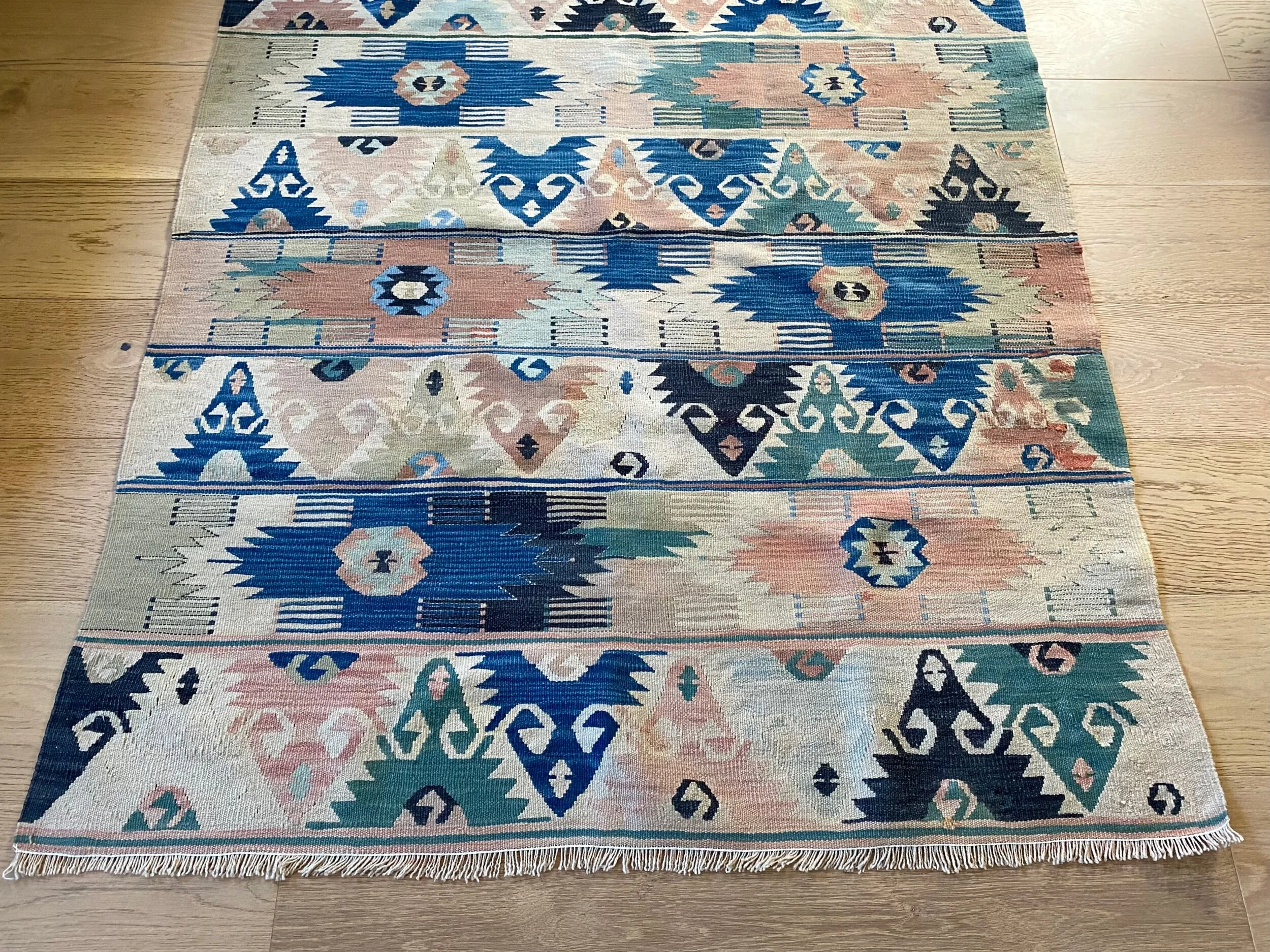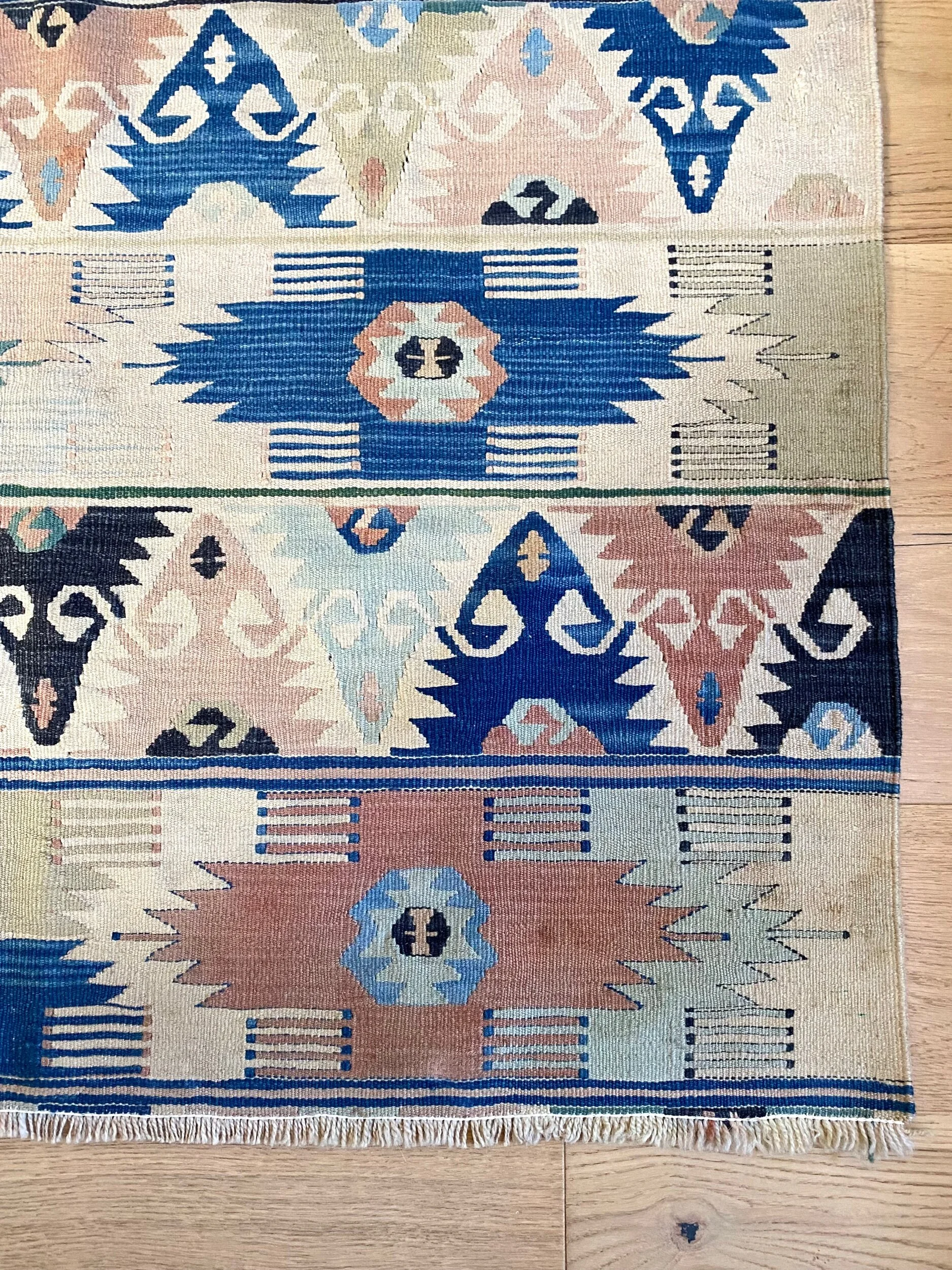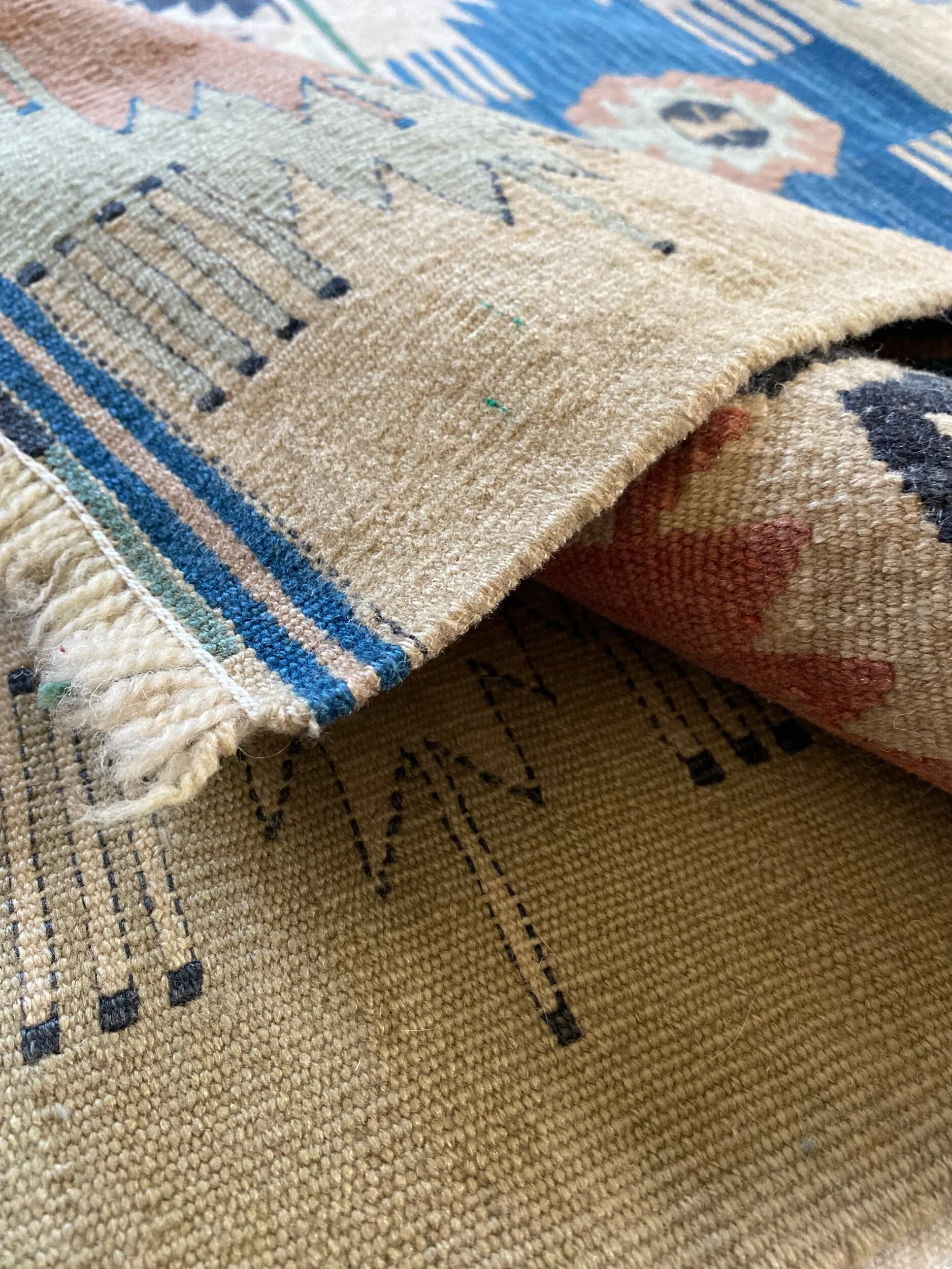 Every kilim and rug shows wear and irregularities in shape, size, color and craftsmanship. These qualities are intrinsic to aged, handmade goods and contribute to the charm of vintage textiles. Any notable flaws are shown in photographs. Each rug is professionally cleaned / repaired and arrives ready to enjoy.